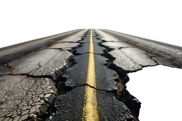 Cracked asphalt road with double yellow lines and dry grass on the sides isolated on a transparent background