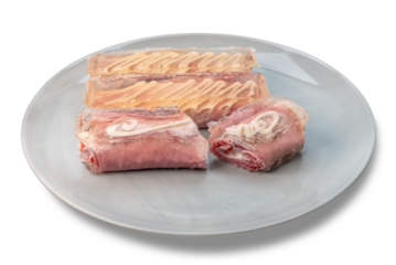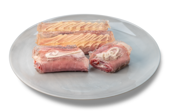 Jellied ham rolls stuffed with mayonnaise in plate isolated