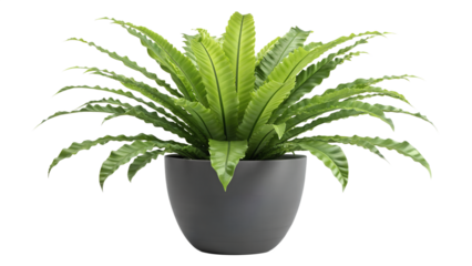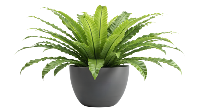 Lush green bird's nest fern in modern grey pot, isolated on a transparent background, PNG