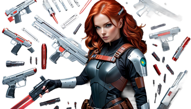 sword laser fi futuristic assassin back character pistols two hunter 3d aded portrait bounty gorgeous sci background rendering female posing samurai handgun gun leather elegant white young caucasian