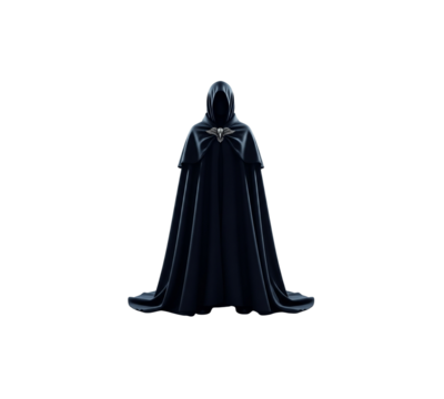 Mysterious cloaked figure dark fantasy costume grim appearance hooded cowl black robe isolated studio shot