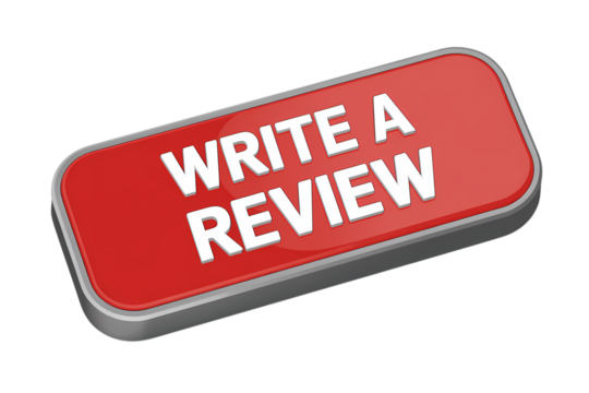 3d icon red button with the words write a review . Isolated on transparent background, png