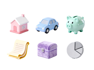 Financial Dreams and Assets: A collection of symbolic assets including a charming house, a sleek car, a piggy bank, important documents, a treasure chest, and a financial chart.