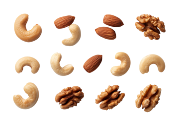 Assorted nuts including cashews, almonds, and walnuts arranged on a white background. Healthy snacks for nutrition and energy.