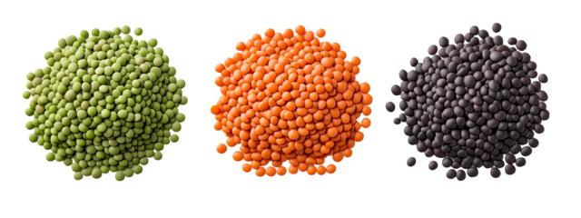 Three piles of black lentils brown lentils and red lentils falling on transparent background