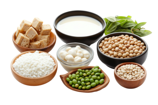 Assorted soy products: milk, tofu, beans, and rice in wooden bowls, cut out