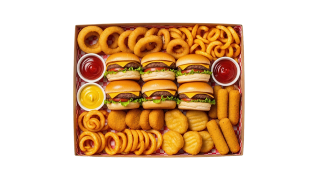 Fast food party pack with mini burgers sliders and assorted deep fried snacks isolated on white background