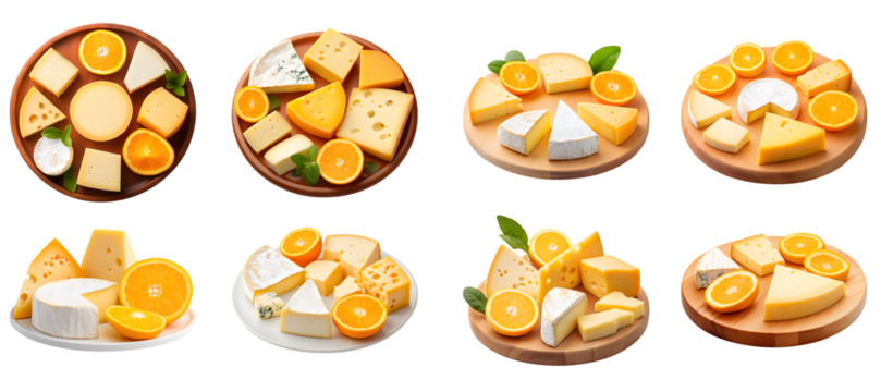 Collection of various a cheese platter featuring different cheeses served with fresh orange slices isolated on white transparent background PNG set
