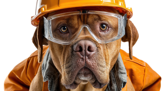 Canine Construction Supervisor: A strong pitbull stands ready for a day of work, donning protective goggles and a hardhat. This image is a humorous take on industrial professionalism.