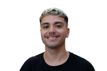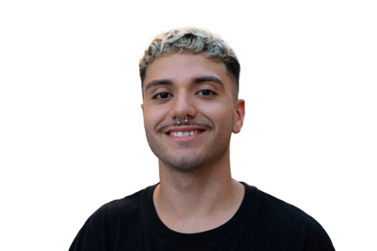 A young man with short curly bleached hair, a septum piercing, and light stubble looks confidently at the camera, wearing a black shirt against a dark background.