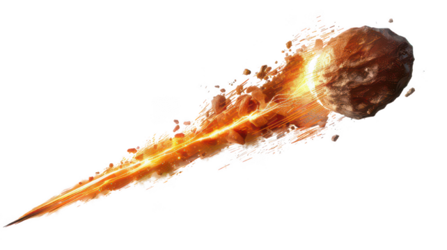 Large asteroid entering planet's atmosphere leaving a bright fire trail, on transparent background