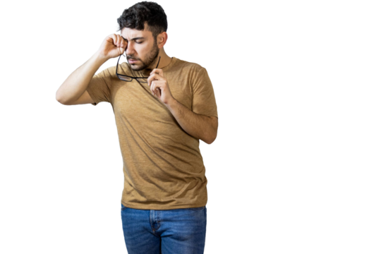 Young Asian man suffering eye discomfort while holding glasses, feeling eye strain or irritation, isolated on transparent background