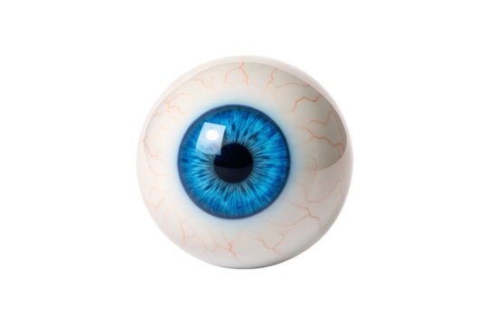 Bloodshot human eyeball with red veins and blue iris displaying realistic medical anatomical detail and texture, isolated on a transparent background