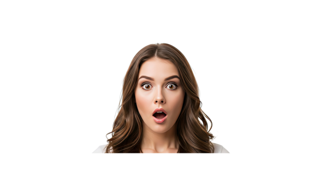 Excited woman with surprised expression on transparent background