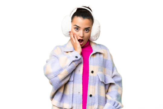Joyful brunette woman expressing surprise with hands raised on transparent background