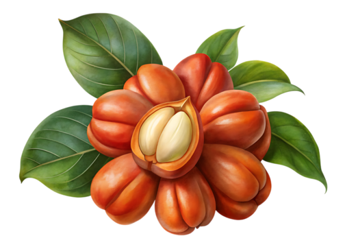 Watercolor painting of ripe red garcinia atroviridis fruits with green leaves, one fruit cut open showing pale seeds, isolated on transparent background