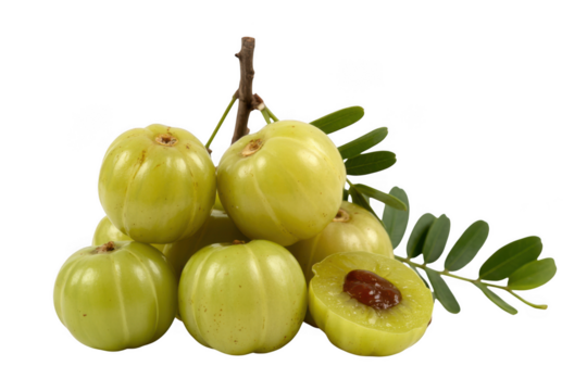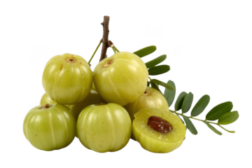 Set of orange persimmon with a green leaf, isolated on white transparent background. Represents natural fruit and healthy food concepts