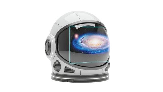 Astronaut Helmet Showing Colorful Galaxy on Visor Against Black Backdrop
