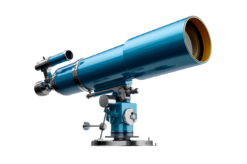 Shiny metallic telescope on stand against dark background, cut out transparent