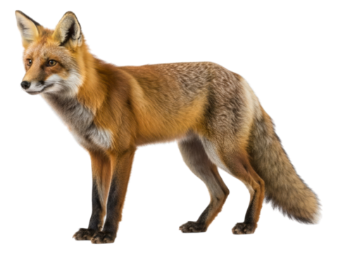 Red fox with thick fur stands sideways, against transparent background