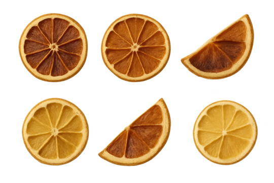 Citrus slices and wedges arranged in flat lay, orange rounds and lemon halves with dried-brown wedge