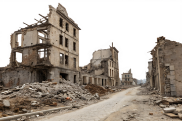 Destroyed buildings after earthquake isolated on white t background.AI GENERATED