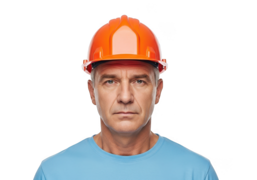 A serious man wearing a bright orange construction hard hat and a light blue t shirt isolated on transparent background