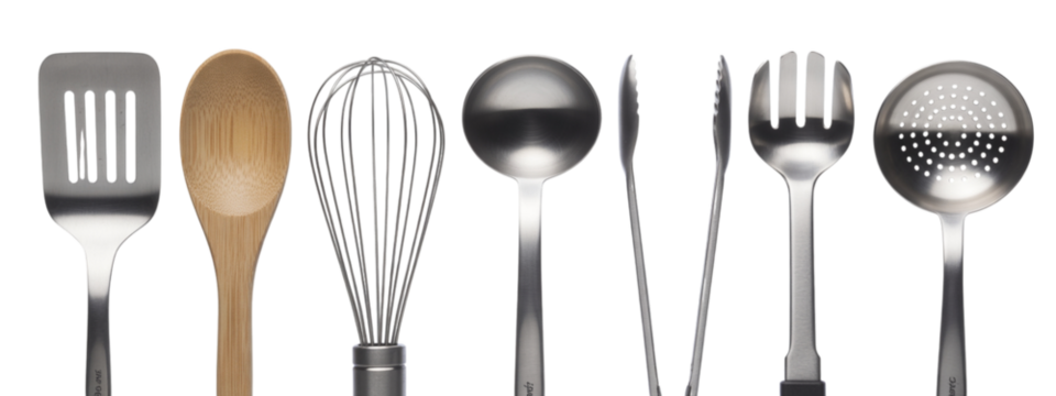 Elevate your culinary space with this modern kitchen utensil set, showcasing stainless steel and bamboo tools for cooking, baking, and serving delicious meals at home or professionally