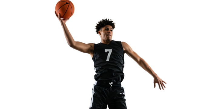 Young male basketball player in black uniform jumping to shoot a basketball perfect for sports and athletic themes