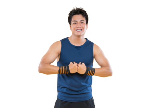 A fit man is enthusiastically greeting, preparing for exercise on png background