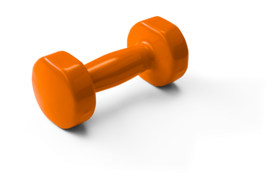 An orange dumbbell lies on a white matte surface. Isolated with shadow on a transparent background. Selective focus.