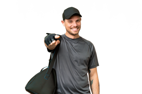 Young sport man with sport bag over isolated chroma key background with thumbs up because something good has happened
