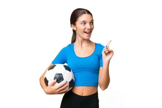 Teenager caucasian girl playing football over isolated background intending to realizes the solution while lifting a finger up