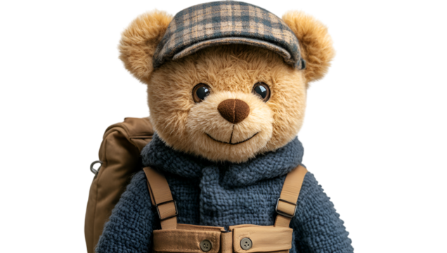 a stuffed bear wearing a hat and backpack.