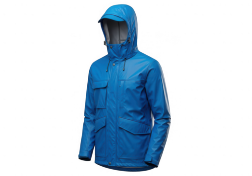 Blue hooded lightweight outdoor jacket isolated on transparent background