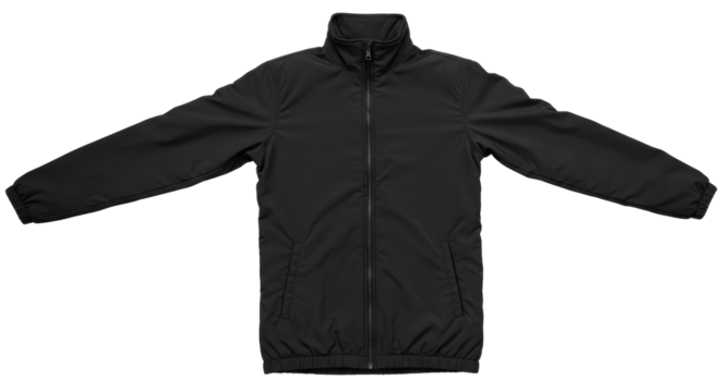 Isolated black hooded waterproof jacket on transparent background, stylish wear