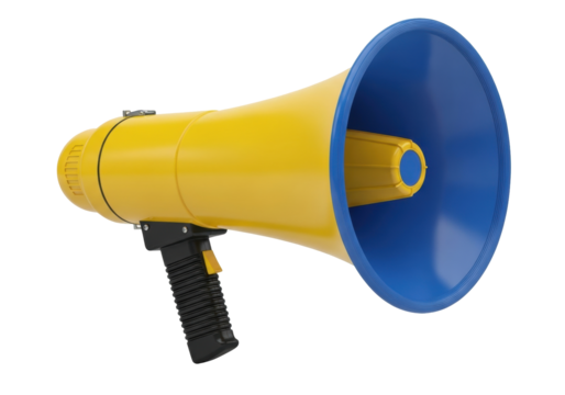 Isolated Yellow and Blue Megaphone Audio Communication Device Public Address System Voice
