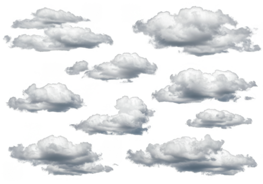 A group of white clouds sit stacked on top of each other, with clear blue sky and no other objects in the frame