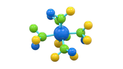 3D Molecular structure with blue spheres and colorful rods on transparent background
