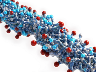 Molecular structure model with red, blue, and gold components against black background