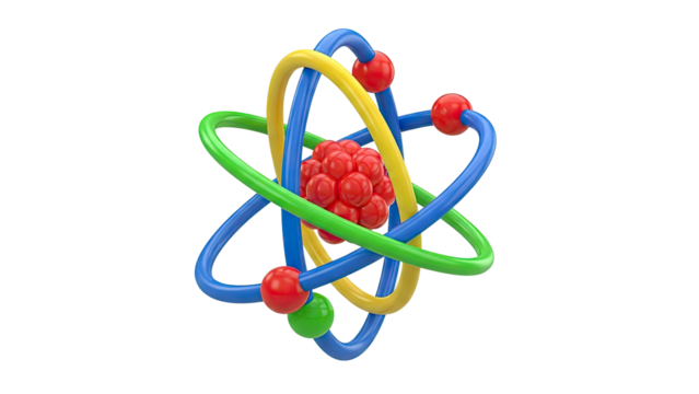 3D atom model with colorful electrons and nucleus structure isolated on white background for scientific and educational projects