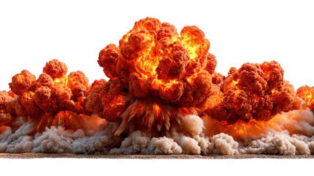 A massive mushroom cloud of fire and smoke rises from an explosion isolated on transparent background