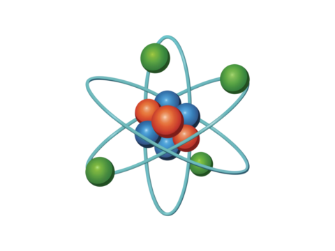 Isolated atom model illustrating structure in red, blue, and gold, on seamless background