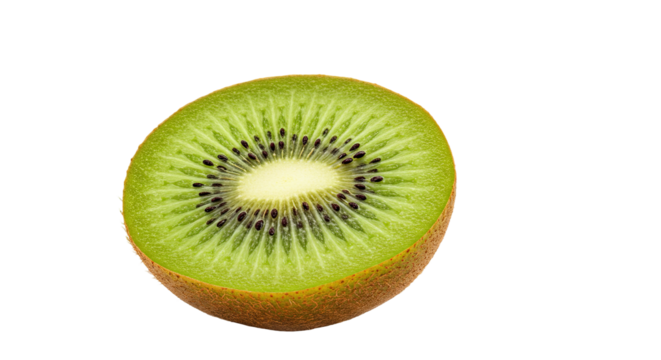 A vibrant green kiwi fruit sliced in half revealing its juicy interior and tiny black seeds.