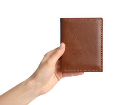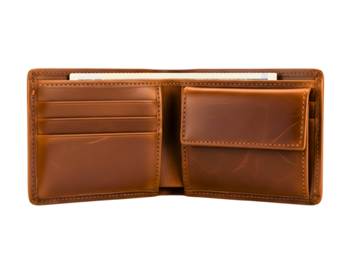 A classic brown leather bi fold wallet opened to reveal its card slots and compartments isolated on transparent background