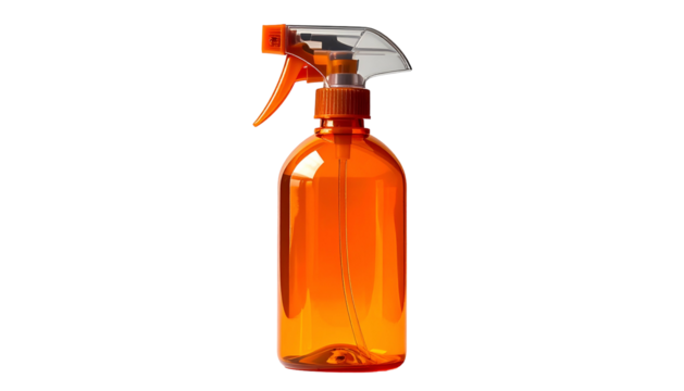 A transparent orange plastic spray bottle, against a black background, with trigger and nozzle