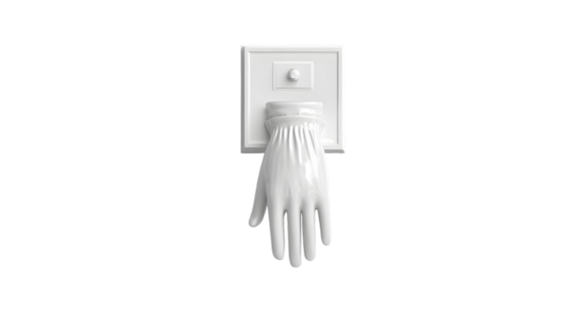 A white hand sculpture attached to a white square on a black background in a studio setting