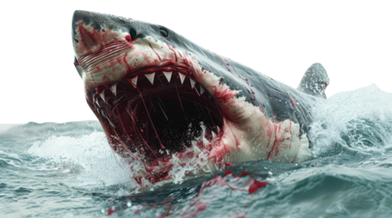 A shark with jaws covered in blood swimming in water isolated on transparent background.