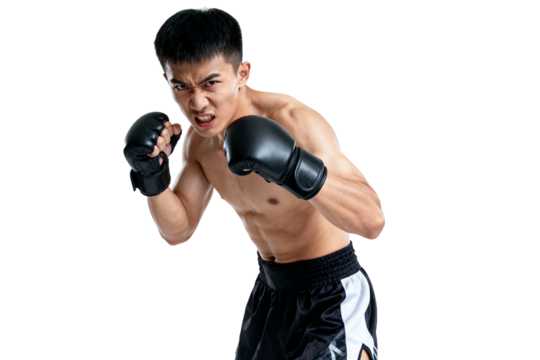 Determined mixed martial arts fighter in offensive stance isolated