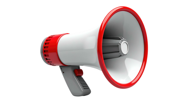 Red megaphone amplifying important breaking news, making a loud announcement, spreading a message, transparent background